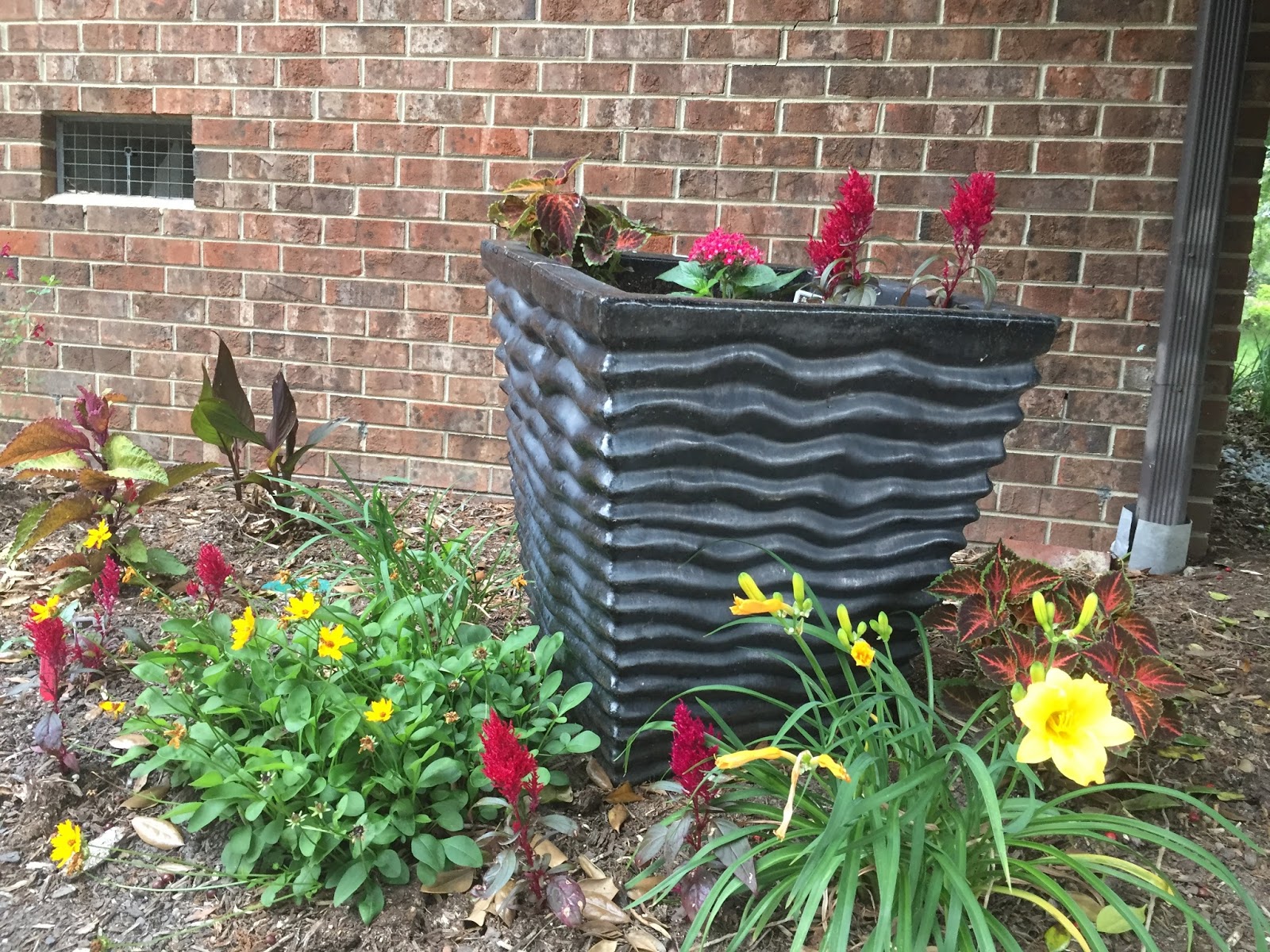 | See this gorgeous planter? That plant in the middle is a Yew-essentially a baby bush. It'll be chucked out in the fall but in the interim will give interest and height. |